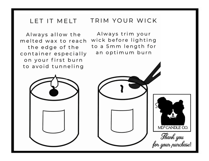 MD candles are 100% Soy Wax. Soy Wax is non-toxic and cleaner-burning being made with no toxins, carcinogens, or pollutants which means our candles are less likely to trigger allergies. Not only are there “green” advantages to choosing soy wax over a different type of candle wax, but soy wax also burns slower than paraffin wax, meaning you get a candle that lasts longer.